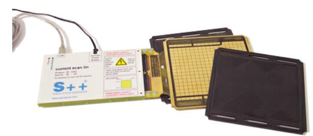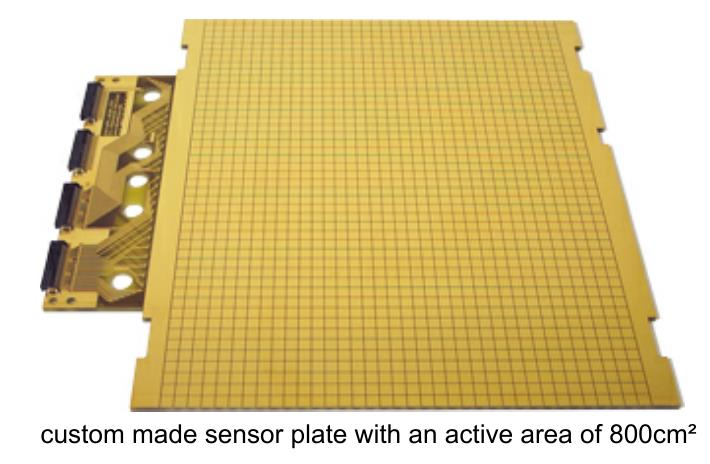 The image below shows a custom sensor board with an active area of 800cm ² and 46x36 measurement units. Almost any design is possible, with a minimum measurement unit size of 7x7mm and a maximum size limited by the current they have to measure.