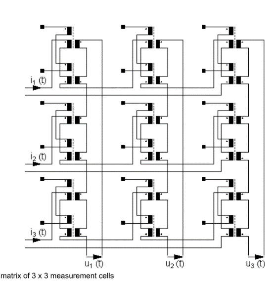 Individual measurement units are carried out in series in rows and columns. AC i1 (t) to in (t) will be continuously fed into the matrix to activate rows 1 to n. voltages from u1 (t) to un (t) will be collected as measurement signals. Measurement units are not activated by AC and do not transmit any information to the measurement signal. In general, n ² measurement points can be reached with 2n pairs of conductors. Therefore, the complexity of connecting wires, controlling and evaluating electrons is linear! In this way, it is easy to establish measurement devices for any large fuel cell.