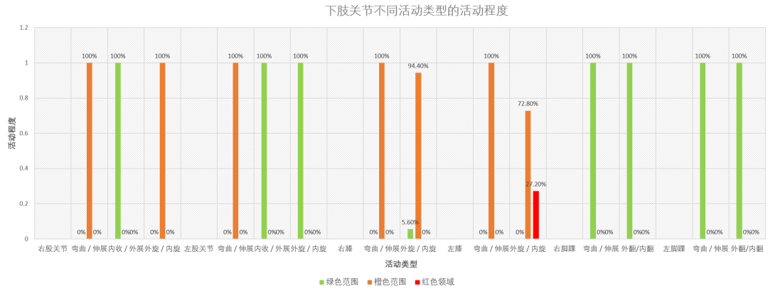上图为关节活动分布图,图中不同颜色**固定的活动范围,以肩关节为例,垂直旋转活动中绿色表示0°-60°,橙色表示60°-90°,红色表示大于90°,其中绿色表示正常活动范围,红色**异常活动范围。