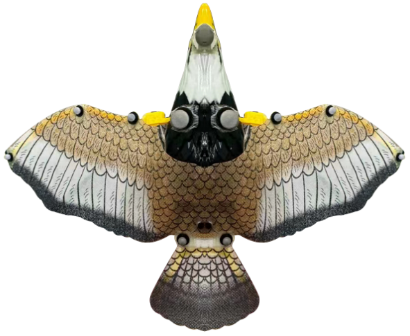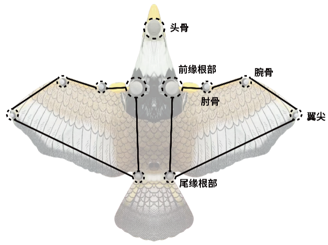 The technicians of Shanghai Fengyou Biomechanics Laboratory used the Swedish Qualisys motion capture system to compare and analyze the flight kinematics characteristics of the eagle simulation model. Spherical markers with reflective characteristics were affixed to key parts of the experimental subjects, including skull, leading edge root, elbow bone, wrist bone, wingtip, and caudate root.