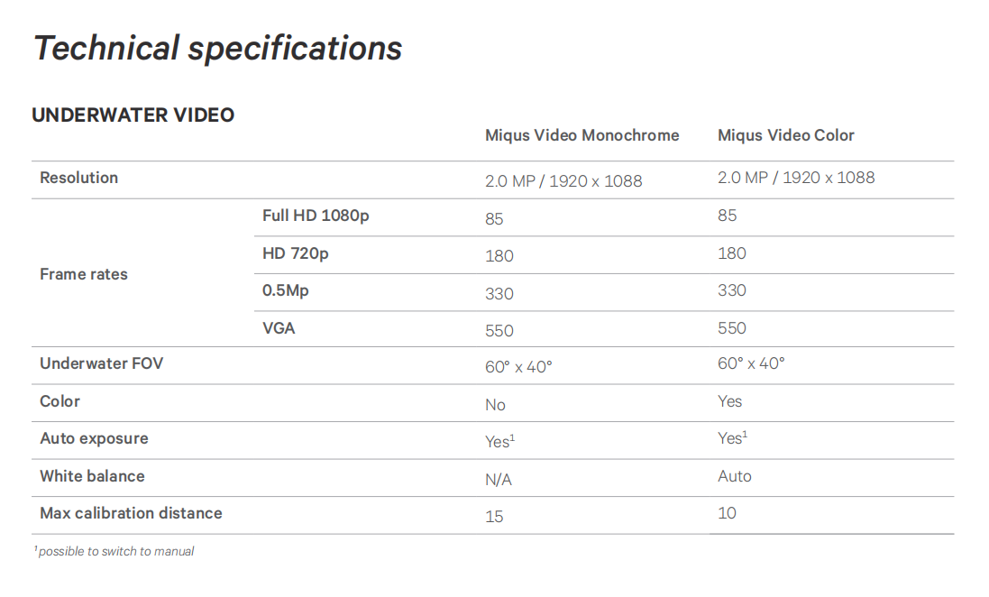 SYNCHRONIZED UNDERWATER VIDEO Miqus Underwater video can be synchronized and calibrated together with the motion capture cameras to enable 3D video overlay. It can be used as a standalone video solution, bridging the gap between small, hand-held consumer devices and more expensive cameras that are typically used in industrial settings. The Miqus Underwater video camera streams MJPEG compressed, full HD video in 85 fps over standard gigabit Ethernet.