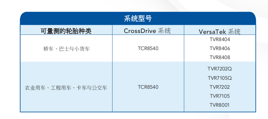 TireScan系统配置 • CrossDrive 系统 • VersaTek ® 系统 – 适用于轿车、巴士与小货车等轮胎 • VersaTek ® 系统 – 适用于飞机、农业用车、卡车与公交车等轮胎