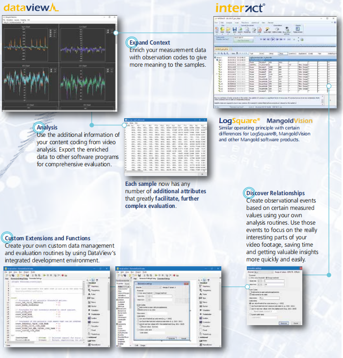 Synchronized DataView synchronizes itself with other software solutions from Mangold. This allows you to view, interpret and further evaluate measurements and qualitative observations in sync.