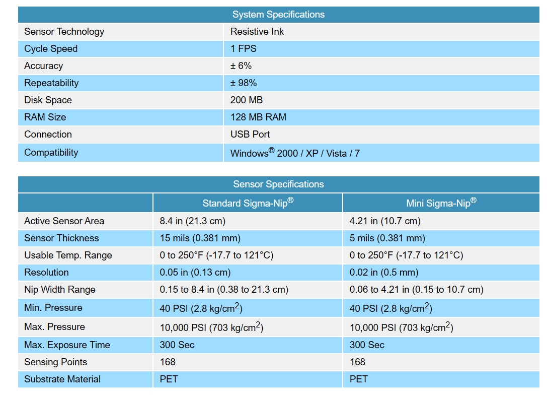 Through the application of sophisticated mathematical algorithms, Sigma-Nip® is able to discern the contact profile of the machine's cross direction with a higher degree of accuracy never before attainable. Each sensor is individually calibrated, serialized and carefully assembled to exacting tolerances. The sensor is designed to withstand repeated high pressures, conform to radiused surfaces and routine exposure to grease, liquids and inks.