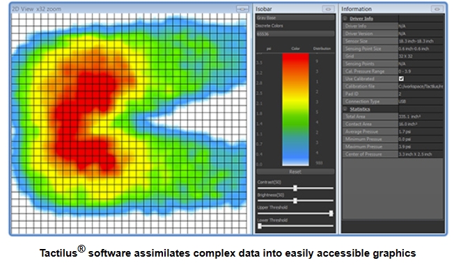 Tactilus® allows the user to capture and record pressure conditions occurring in between any two contacting or impacting surfaces in real time. The paper-thin Tactilus® sensor is actually placed at the contact interface where it records and assimilates both pressure distribution and pressure magnitude on your Windows® based computer.