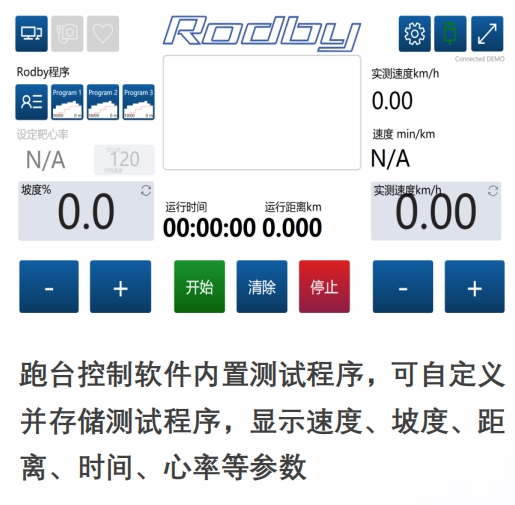 ●中文界面跑台控制和参数显示软件,可无限添加测试与 训练程序,可显示实际速度