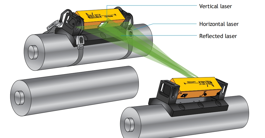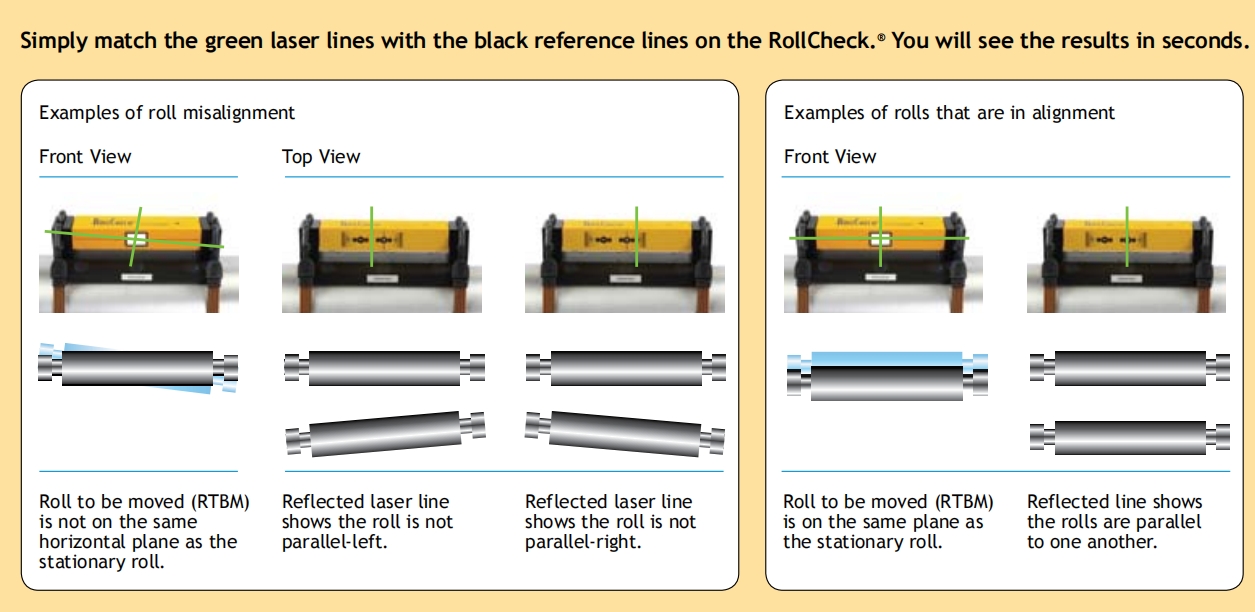 Parallel Roll Alignment, utilizing the RollCheck® Laser Roll Alignment System to measure and correct vertical and  horizontal angle between 2 rolls. RollCheck® is a laser roll alignment system that facilitates accurate visual alignment of process rolls during replacement  operations. The Laser Transmitter is mounted to a stationary roll that transmits two green laser lines to the Reflector positioned  on the roll to be moved. The operator then is able to view both the vertical (pitch) and horizontal (parallel) angles and  accurately adjust the roll into parallel alignment. RollCheck® is suitable for aligning rolls of most diameters that are spaced from  6 (152 mm) to 10 ft. (3 m) or more apart. It also can be used to align and measure crowned rolls as well. RollCheck® eliminates cumbersome trial and error adjustments which lead to scrap, loss of time and output reduction and is the  ideal tool for efficient roll maintenance.