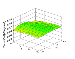 The device of type current scan lin shown befor has a resolution of 17 x 19 measurement cells and an active area of 150cm². It will be placed between the two halves of a bipolar plate at an arbitrary place in the stack. The pictures below show a typical current distribution and a temperature distribution.
