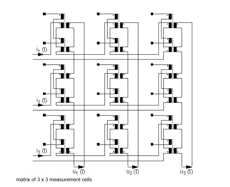 The alternating currents i1(t) to in(t) will be fed consecutively into the matrix to activate the rows 1 to n. At the columns the voltages u1(t) to un(t) will be acquired as measurement signals. The measurement cells, which are not activated by an alternating current, deliver nothing to the measurement signal. In general n² measurement points can be reached with 2 n wire pairs. So the complexity for connection wires, control and evaluation electronics is linear! This way, measurement devices for arbitrary large fuel cells can be built easily.