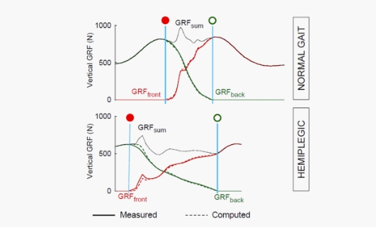 Someone might say, an algorithm is a mathematical model and all models have their weaknesses. It is true, but the relative error is almost negligible, compared to those resulting from unnatural walking pattern on a split belt treadmill or on regular force plates. For example, Meurisse et al (2016) validated this algorithm at 374 steps of healthy and 437 steps of clinical gait. Their median of the relative error was 1.8% for the healthy and 2.5% for the clinical gait between the reconstructed and real measured forces. The reconstructed and the real ground reaction forces during double contact phase are strongly correlated for both healthy and clinical gait data. An example is shown in figure 3.