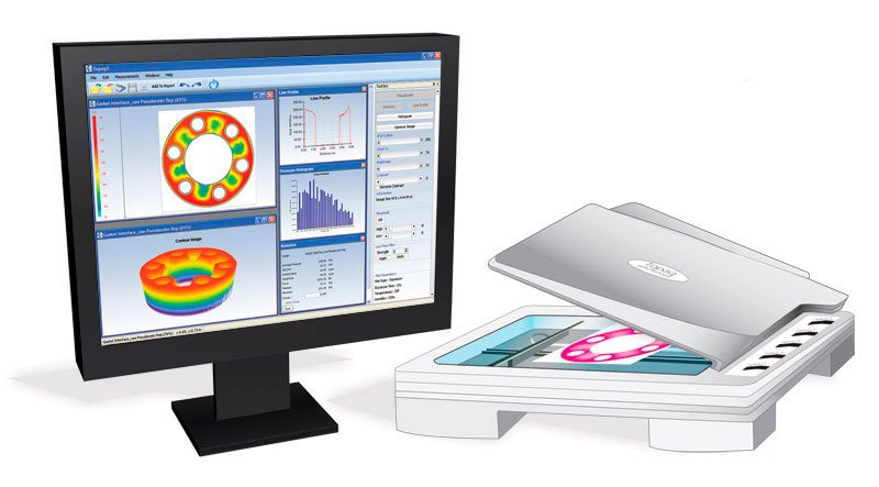 Topaq 感压纸数据分析系统:由经过特殊校准的密度扫描仪和Windows软件组成。通过扫描压敏纸上的图像可以在软件里量化成具体的数据值,可以将压敏纸呈现的图像转换成3维图像。并可以根据色阶区分力值大小。