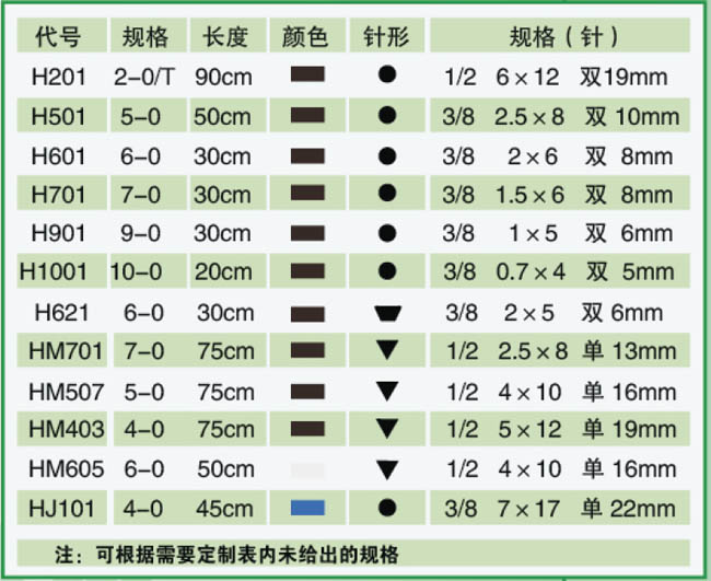缝合针分园针、三角针、直针。型号的意思是,如△1/2 6×14指直径为0.6mm,弦长为14mm,针尖切面为三角形的1/2弧形针.