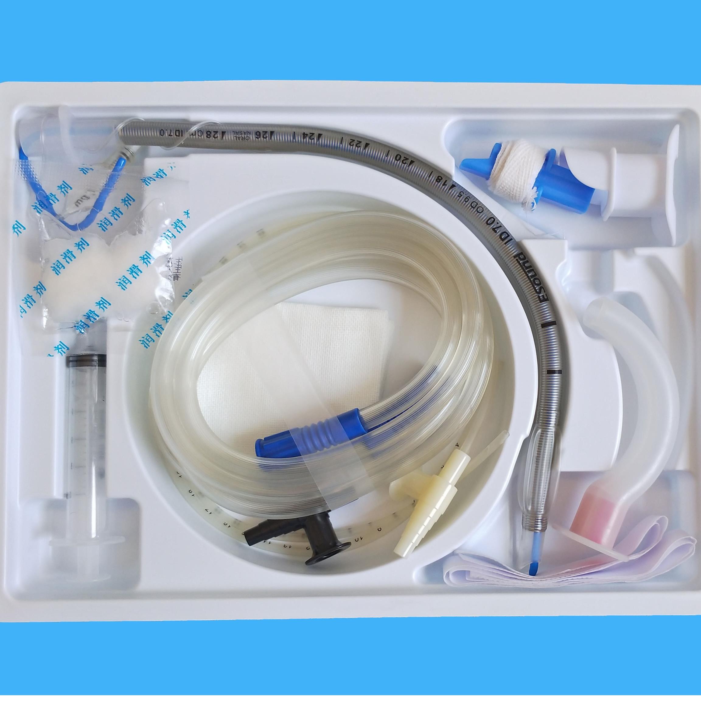 气管插管包选用配置:吸引导管、连接导管、口咽通气道、麻醉喉镜、喉镜片、医用手套、纱布块、洞巾、注射器、导丝等。