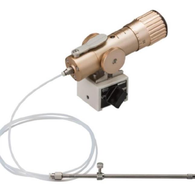手动显微注射仪装有一个一触式减压阀,可以使注射泵内部压力释放。在无内部压力条件下的显微注射泵,通过改变控制旋钮的位置,可以使注射泵在内部微型注射器的总体积发生变化,从而改变了显微注射操作响应的灵敏度:这是气压式显微注射泵的设计特征。