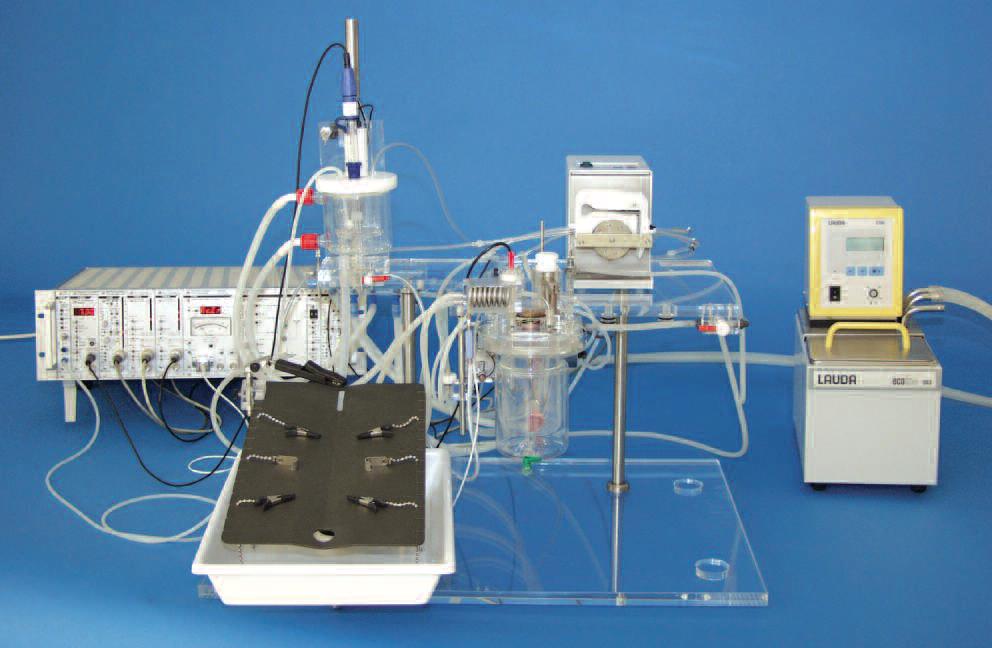 基本设置包括一个亚克力底座和两个稳定的垂直钢柱。主系统安装在固定的亚克力板上在两个钢柱子上。这允许动物离体肺肺切片灌注系统被修改或扩展以适应不同的版本或特定的应用。这个系统的关键部分是人工胸腔。它由一个专门设计的盖子密封的水套玻璃罐组成。盖子安装在亚克力板上,玻璃罐用两个金属夹固定在下面。盖的内侧是器官夹持器连接气管(通气)、肺动脉和左心房(灌注)。在负压和正压下都可以进行肺通气(正压在准备阶段是应有的)。呼吸参数由一个专门的PLUGSYS呼吸机控制,吸入气体(空气或混合气体)通过内置加湿器不断加湿。