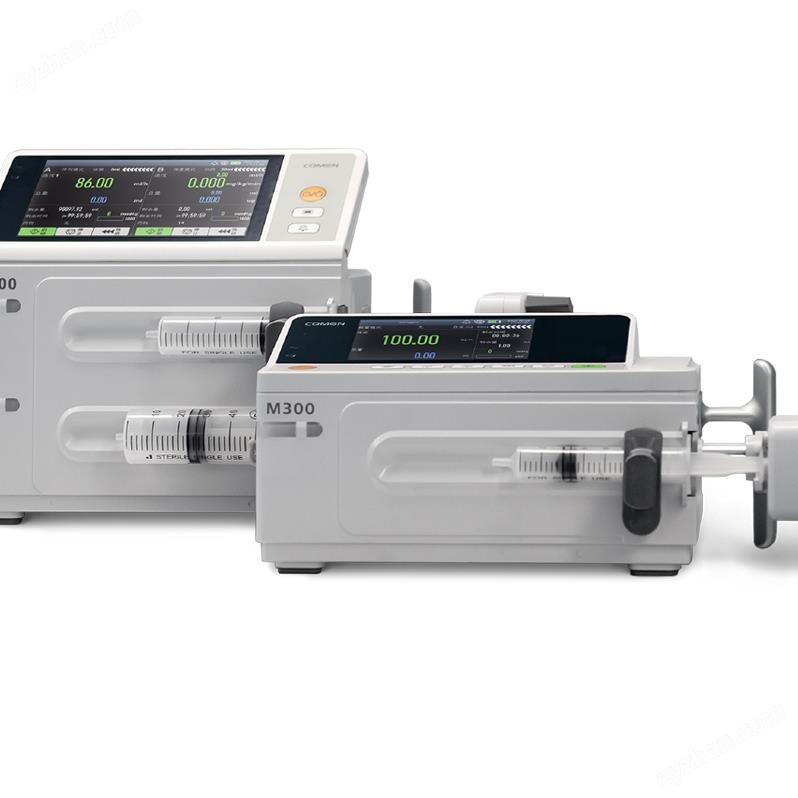 注射泵M300、M500由泵外壳、电机驱动系统、输入系统、存储系统、控制系统、显示系统、传感监测系统和报警系统组成。与特定注输器具配套,用于动、静脉长时间恒定给药速度和精确给药量输液,不用于镇痛药、化疗药物、胰岛素的输注。