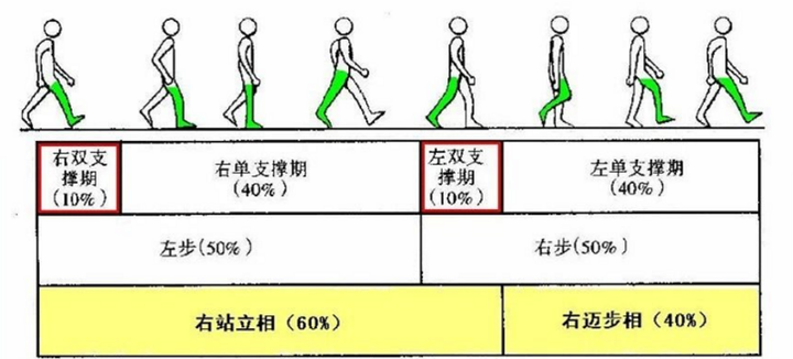 对于指定的下肢,步态周期的活动可以分为支撑阶段和摆动阶段。支撑阶段分为脚跟着地、足趾着地、支撑中期、足跟离地、蹬离期和足趾离地的动作阶段。摆动阶段分为加速期,摆动期和减速期。当以恒定的速度行走时,支撑阶段约占整个步态周期的60%-65%。