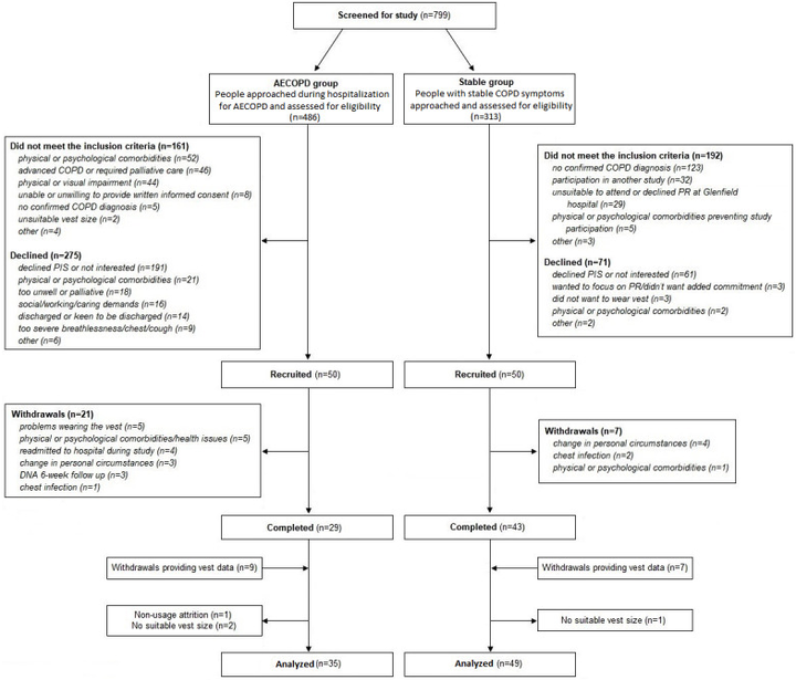 ·AECOPD 和稳定组的招募细节、退出原因和完成率1)AECOPD 和稳定组的 CONSORT(报告试验综合标准)流程图(图3)。AECOPD:慢性阻塞性肺疾病急性加重;COPD:慢性阻塞性肺病;DNA:没有参加;PIS:患者信息表;PR:肺康复。