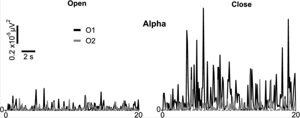 睁眼或闭眼时位置 O1 和 O2 的 alpha 波段功率随时间变化的示例▾