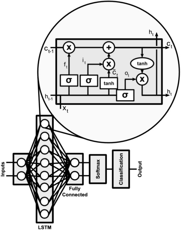 本工作中使用的神经网络架构。LSTM 层具有单元格,其结构如分解图所示。其中 xt是输入,ht 是输出,ct是状态▾