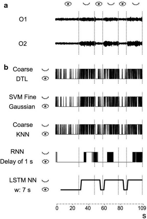 对一个用户使用不同算法得到的分类结果。在 O1 和 O2 位置睁眼和闭眼时记录的 alpha 波段功率。闭眼 20 秒。B具有产生较佳训练精度的配置的 DTL、SVM、KNN和 RNN 算法的分类结果(表的(表格1)1个) 和一个时间窗为7秒的 LSTM 分类器▾
