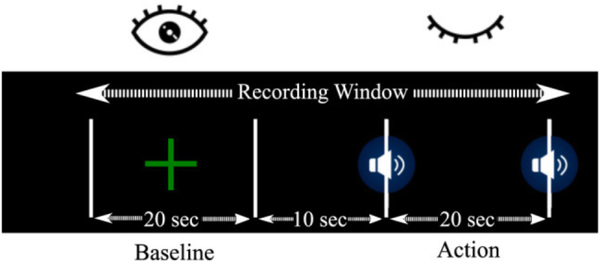 实验方案:每个试验包括20秒的睁眼注视期和屏幕上的十字、10秒的黑屏休息期和20秒的闭眼期。哔哔声标志着何时闭上或睁开眼睛。全程记录脑电图数据▾