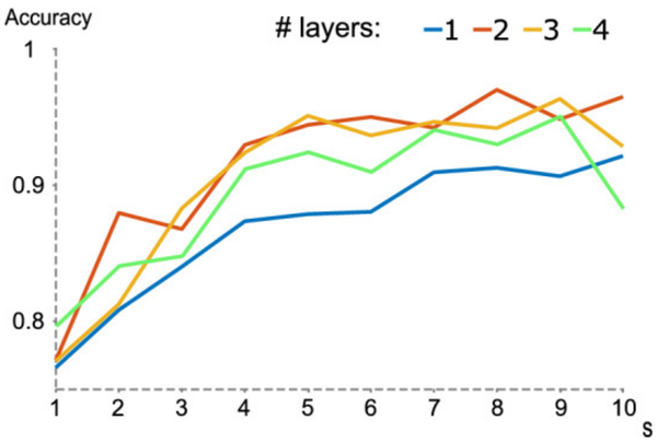 使用具有不同数量的 LSTM 层(每层定义 8 个神经元)的各种神经网络获得的不同精度(y 轴)的表示。已应用 1 到 10 秒之间的窗口(x 轴)▾
