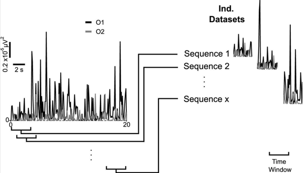电源和数据集生成:LSTM网络的数据集生成,显示了LSTM算法使用的位置O1(黑色迹线)和O2(灰色迹线)处记录的时变alpha波段功率记录示例。功率轨迹被分段(序列1、2、...、x)以供LSTM使用,方法是获取时间窗口中获取的功率,从相关点向后开始▾