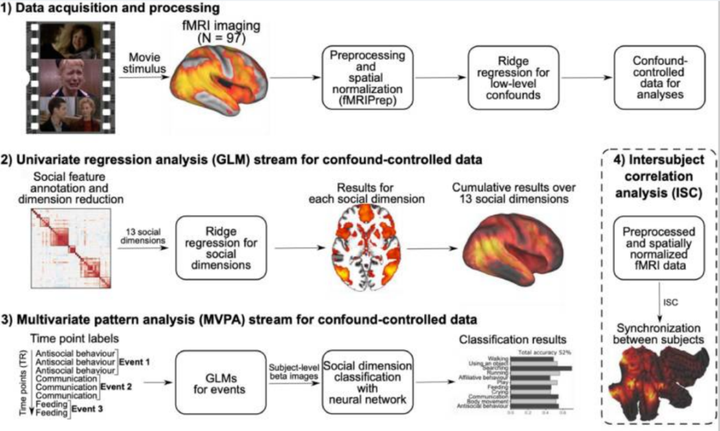 图尔库大学的 Severi Santavirta 和他的同事使用功能性磁共振成像 (fMRI) 扫描了 87 名志愿者的大脑,他们观看了 96 部好莱坞主流电影的短片。其中一些描绘了各种类型的社会互动性行为,一些描绘了一个人单独行动,还有一些只包含动物、风景或物体。