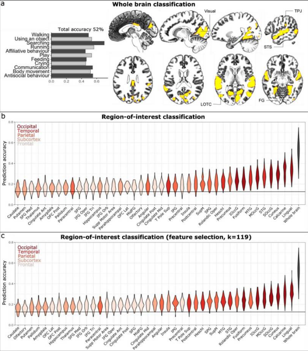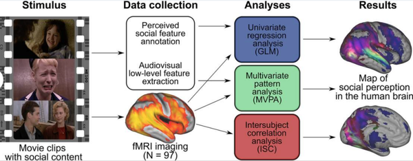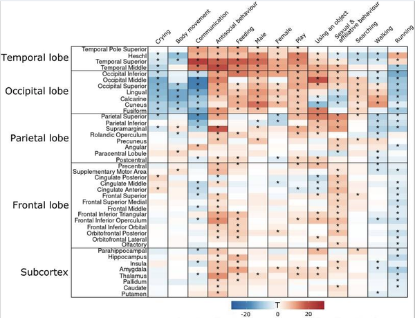 例如,大部分枕叶(大脑中主要负责视觉处理的部分)和顶叶(负责处理感觉信息)对各种各样的社会行为做出反应,而颞叶的两个特定区域(声音和语言处理)对描绘人们交流或Antisocial行为的电影片段反应强烈。