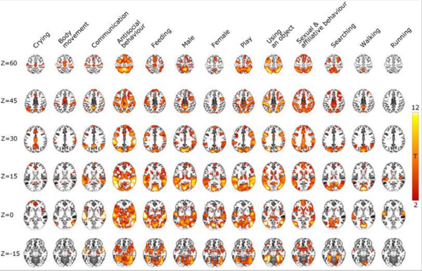 视频刺激的社会感知空间包括描述性和从属关系和Antisocial行为、进食、身体运动、交流和玩耍的社会特征集群,以及男性、女性、跑步、行走、搜寻、哭泣等。