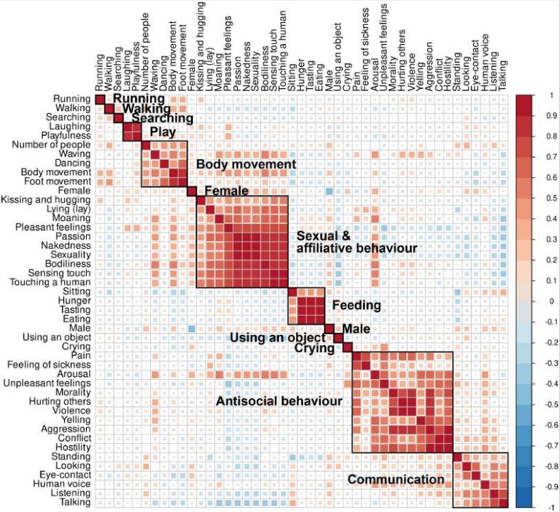 研究人员从视频剪辑中记录了112 种社交特征,描述了范围较广的情况、行为、互动和个人特征,并要求参与者对他们在每个视频剪辑中看到的每一种特征的多少进行评分,从而制作出更多的目录超过28,000 个个人评分。