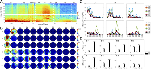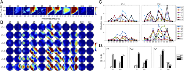 数据记录的原始采样频率为 512 Hz。通过减去每个通道在每个时间点的平均电位,重新参考使用 Fpz 参考记录的来自国际 10/20 系统的 19 个 EEG 通道。陷波滤波器用于去除 EEG 信号中的 60 Hz 伪影及其超谐波。6 个频段被定义为 delta(0 到 4 Hz)、theta(4 到 8 Hz)、alpha(8 到 13 Hz)、beta(13 到 25 Hz)、gamma1(25 到 55 Hz)和 gamma2( 80 至 150 赫兹)。