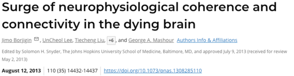 在停止生命维持系统后的几秒钟内,其中两名患者表现出神经生理活动激增,其特征是在局部和整体水平上几个不同的脑波“波段”发生了变化。高频伽玛波(与注意力和感知相关)和低频贝塔波(与注意力和专注力相关)变得更大,并且在多个大脑区域变得更紧密地耦合。此外,两个半球不同区域内不同频率的脑电波也变得更加同步。