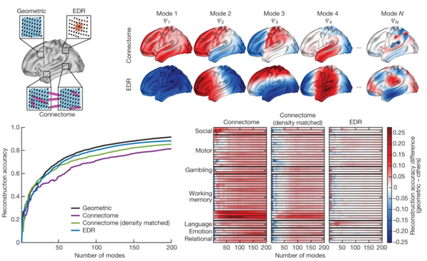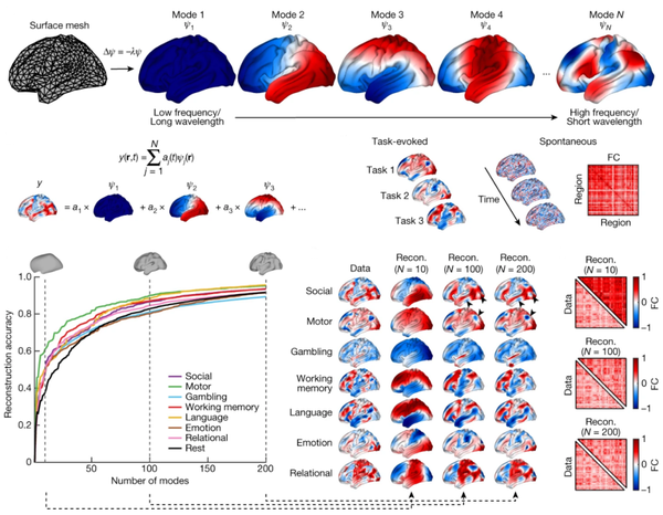 因此,较新的实验表明,这些共振波模式(称为“本征模式”)也在塑造大脑活动方面发挥着作用。并提出,人脑特有的褶皱有助于推动其运作,基于大脑几何形状的模型比基于“连接组”的模型可以更好地解释神经活动的新观点。