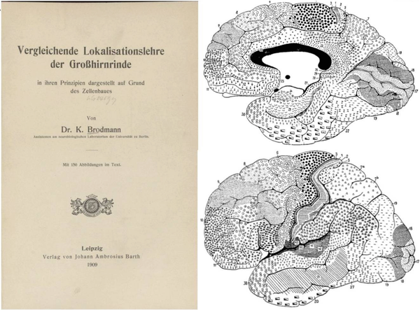科尔比尼安·布罗德曼 (Korbinian Brodmann) 发表了他开创性的大脑图谱,根据细胞结构将大脑皮层细分为52 个区域。