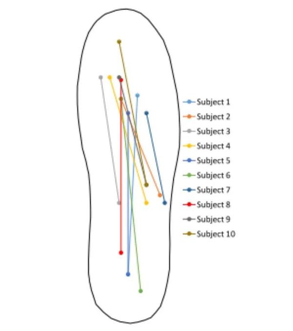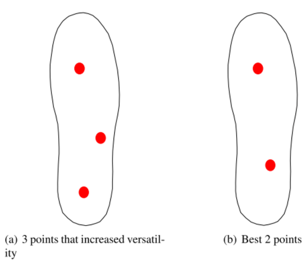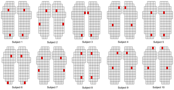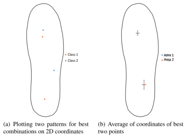 为了以目前的传感器配置来根据足部压力估计日常姿势和听力,以循环方式评估以选择两个点组合组成较佳组合的较佳测量点。