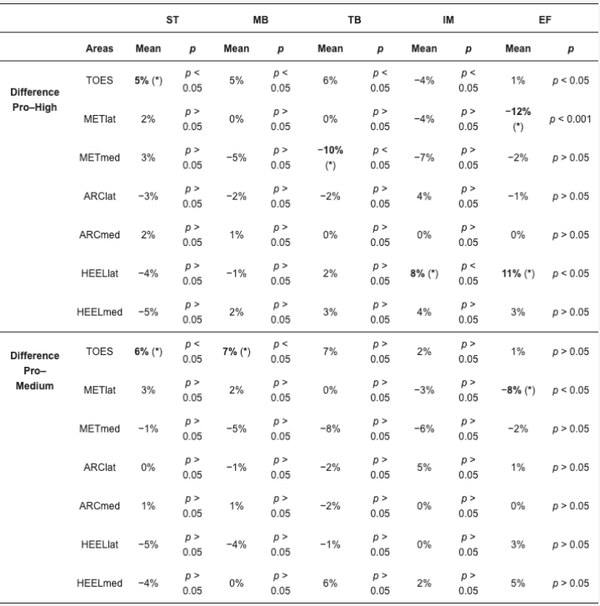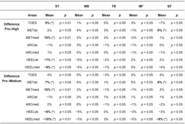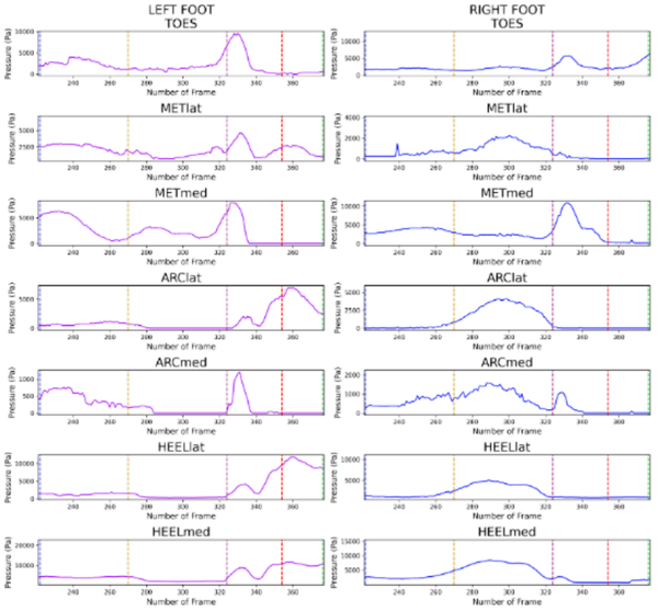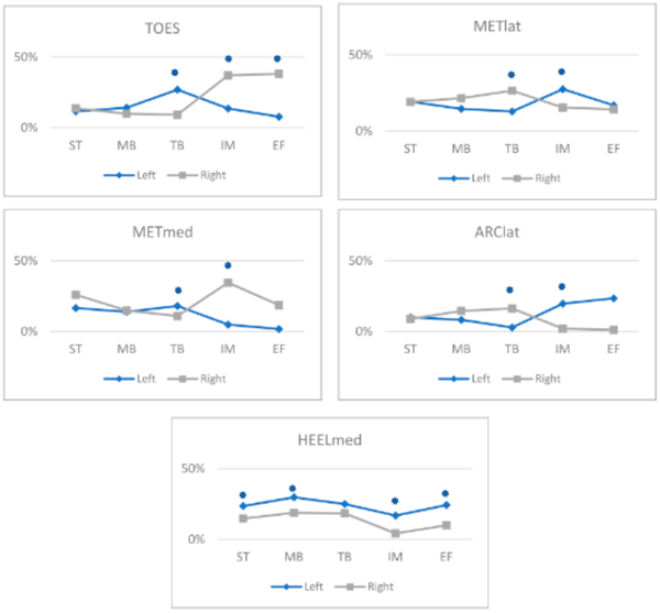 对各俱乐部职业球员每只脚的5个关键时刻的左右脚两侧7个区域进行了35对比较。在这70个比较中,54个案例显示出显着差异。图 5 显示了五个区域(TOES、METlat、METmed、ARClat 和 HEELmed)的归一化压力,其中在一个或多个关键时刻发现了统计上显着的差异(这些情况用 * 符号标记)。其余两个区域(ARCmed 和 HEELlat)未显示,因为在任何关键时刻均未发现统计显着差异。