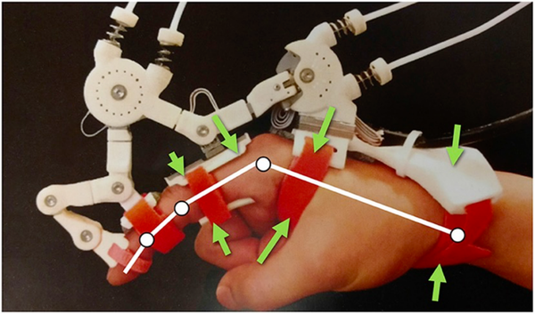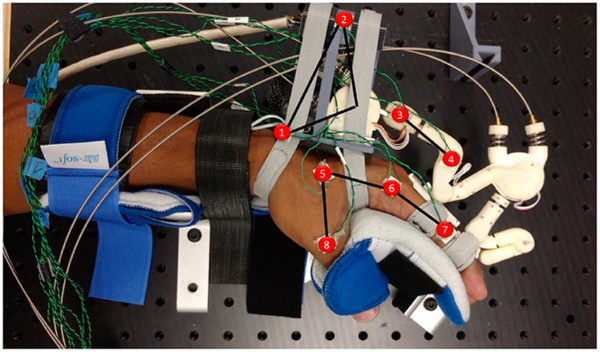人手固定在一个用铝槽螺栓并用螺栓固定的支架中(可以在手的手掌表面的手指和拇指之间看到修改)。Maestro手部外支架固定有经过的支架(链接1-2),可对肥胖带子进行安排预张紧。运动捕捉传感器以红色突出显示。(图6)