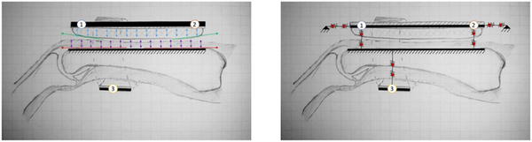 在外支架摆姿势普拉时,较靠近MCP关节的PHRII终止将剥离并失去与皮肤表面的接触。图(左)近指节骨扬点抬升模拟预测示例。(右)实验描绘过程中的物理表现。