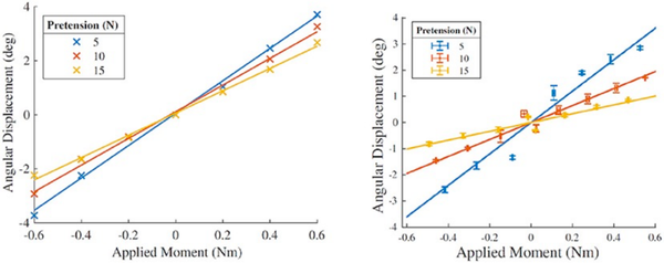 低带预紧力下角地质的实验值与预测值非常接近。在上部的张力下,人体软组织的非线性行为变得更加明显,预计预测值与实验值之间会出现偏差。在不同的刚带度(右)在物理实验中相同条件下观测到的角度。