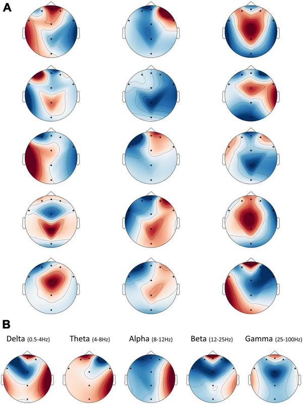 第二层权重的插值空间分布绘制每个 sinc 带通滤波器有五个空间滤波器,每列从左到右代表一个相应的sinc滤波器,如图 3所示。根据来自前一层的带通滤波器,网络第二层的空间权重被分为各自的频带(或最近的频带)。然后,对每个频带内的所有空间权重进行平均,以产生每个频带八个最终权重。研究选择通过对每个标准 EEG 频带范围内的空间权重进行平均来对这些滤波器进行整体解释。这些表明,平均而言,在除 Alpha 之外的所有频段中,网络利用来自额叶电极 FPZ 的信息最多。此外,额叶 Delta、Beta 和 Gamma 对预测的巨大积极贡献。同时,Alpha带在平均权重方面表现出半球不对称性,使得右半球与正预测呈正相关,而左半球与负相关。