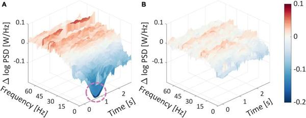 如图 6A所示,在刺激出现后 0.5 秒左右,较低频率范围 (0.5−10 Hz) 的顶部和底部平均频谱图之间存在显着差异。这由该时间点深蓝色大倾角周围的粉红色圆圈表示,其对数 PSD 差异接近 -0.2。重要的是,不同时间点的附加频率在高 WTP 值和低 WTP 值之间存在差异,如深红色和蓝色所示,分别代表近 0.1 和 -0.2 PSD 的对数差异。(A)顶部和底部平均频谱图四分位数的平均频谱图之间的差异。(B)中高和中低平均频谱图四分位数的平均频谱图之间的差异。产品图片在零时间出现,标志着试验的开始。粉色虚线圆圈围绕着对数 PSD 的显着差异。