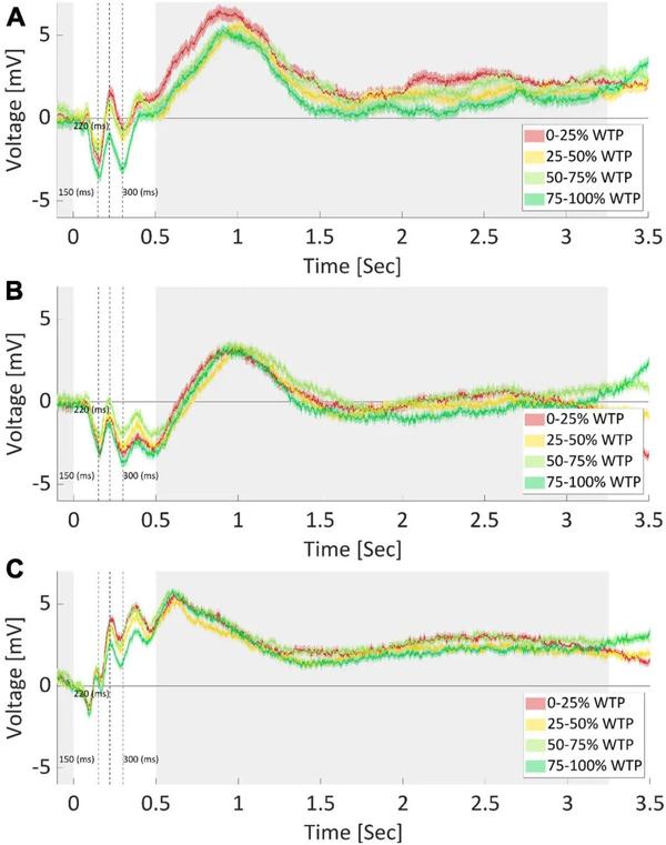 对每个WTP 四分位进行平均后,跨受试者和产品的电极 FPz (A)、F7 (B)和 Cz (C)的 EEG 记录。产品图片在零时间出现,标志着试验的开始。线周围的不透明边界表示每个数据点的 SEM。显然,每个电极记录了不同的响应,并且需要不同的特征提取程序,进一步证明了优化和自动特征提取的需要。阴影区域标记了支付意愿四分位数之间未发现差异的时间点。虚线分别表示 150、220 和 300 毫秒标记。请注意,除了通过识别的三个分量(N150、P220 和 N300)捕获的特征之外,四分位数之间的信号的许多其他特征可能有所不同。