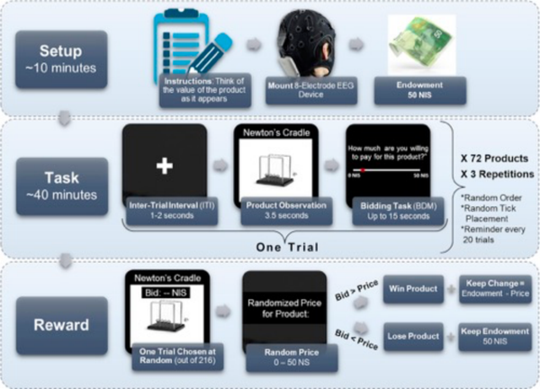 该项研究开发了一个深度学习网络(DLN),根据受试者的脑电图数据预测他们的支付意愿 (WTP)。在每次试验中,213 名受试者观察了 72 种可能产品中的产品图像,然后报告了他们对该产品的 WTP。DLN 利用产品观察的脑电图记录来预测相应报告的 WTP 值。