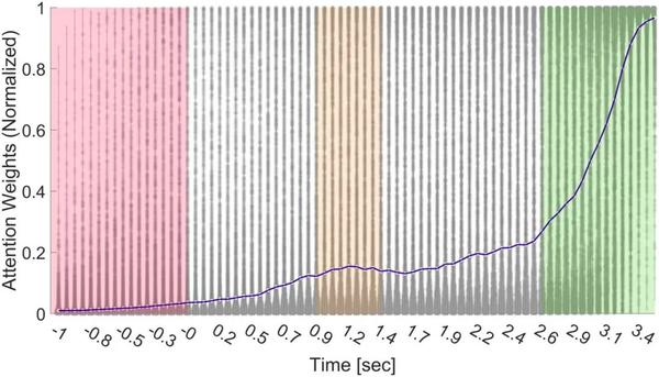 图 4显示了所有受试者和试验的权重分布(为了更好的可视化而在 0 和 1 之间归一化)及其中位数(表示为蓝线)。在时间点-1到0秒(红色区域)之间,受试者观看黑屏(ITI);因此,这些时间点的重要性较低。在刺激开始后 0.9−1.3 秒的时间点(橙色区域),我们可以看到重要性的增加,这可能意味着刺激值的初始处理。当输入到达注意力层时,它由 75 个时间点组成(由于平均池化),每个时间点都有每个输入生成的单独权重。研究将所有样本传递到最终网络并保存所有权重。在此基础上,每个时间点所有权重的小提琴分布以生成权重分布图。在时间点 –1 到 0 秒(红色区域)之间,受试者观看黑屏,在刺激开始后 0.9–1.3 秒(橙色区域)之间,重要性略有增加,从时间点 2.5 开始,可以观察到重要性大幅增加(绿地面积)。