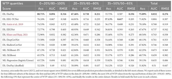 在这项研究中,使用最先进的 DLN,可以根据同一受试者在观察产品图像时记录的脑电图来预测受试者对产品的 WTP 值。独特的网络架构,特别适合脑电图解码和解释,以及实验使用的元处理,在预测高于和低于中位 WTP 值时达到了 75.09% 的准确率,AUC 为 0.832。在预测连续 WTP 值时,网络还实现了 0.276 RMSE。在所有情况下,该研究的网络都比其他深度学习网络更好,超过了利用手动特征提取的机器学习方法的结果,并大幅超过了随机结果(洗牌标签)。