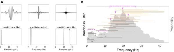 由于网络的架构,将第一层解释为带通频率滤波器,并将随后的卷积解释为特定频带的空间滤波器。(A)来自经过训练的网络的前 3 个过滤器示例;底部 - 每个滤波器的傅里叶变换。(B)来自网络的所有 sinc 带通滤波器的聚合。每条水平线代表一个带通滤波器,使得该线在滤波器的截止频率处开始和结束。不透明灰色的直方图显示了所有滤波器中每个频率的总体比例。