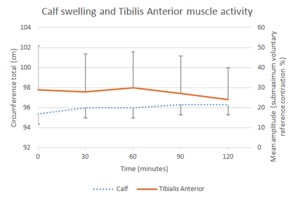 图2. 长时间稳定2小时内的平均小腿总肿胀(标准差)和胫骨前肌幅度。