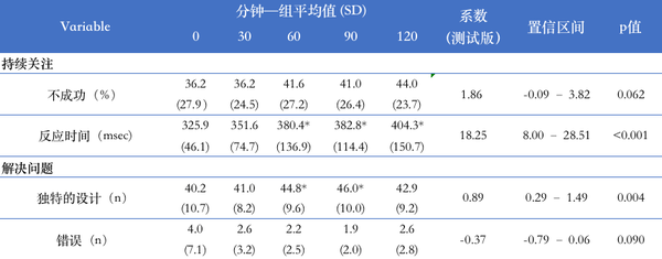 图4:长时间持续2小时以上的持续注意力、不成功和反应时间的平均(标准差)分数